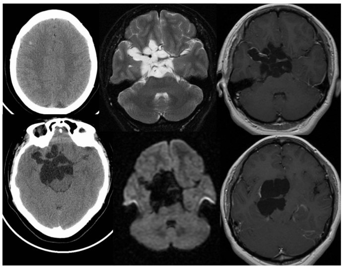 Fig 2: Racemose form of NCC. Multiple CT and MR images demonstrate multilobulated and multiseptated CSF signal/density structures within the suprasellar cistern, associated with localised mass effect and a few linear areas of peripheral enhancement.