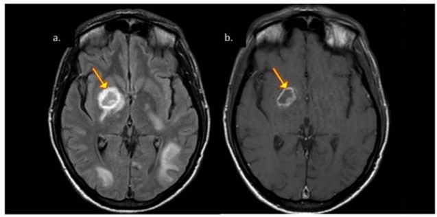 Fig 3: Patient with CNS toxoplasmosis. A. Axial FLAIR exhibiting hypointense lesion in the nuclei of the base with hyperintense peripheral halo (arrow). B. Axial T1 exhibiting the same hypointense lesion with peripheral ring enhancement. Mural nodule (eccentric target signal).
