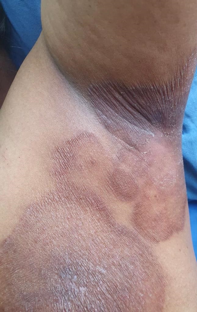 A 20-year-old male came with an itchy rash that he had since one month. The patient tried multiple over-the-counter creams with steroids, and various tablets like terbinafine and cetirizine but got only temporary relief.