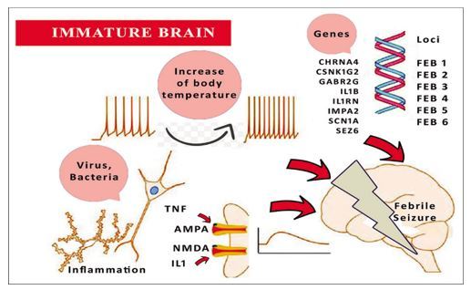 - In genetically predisposed children, an increase in brain temperature leads to perturbation of temperature-sensitive ion channels that in turn causes increased neuronal firing.