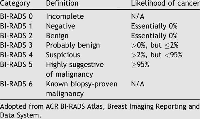 The technique remains the same and is reported as per Breast Imaging Reporting and Data System (BI-RADS) as shown in the table below.