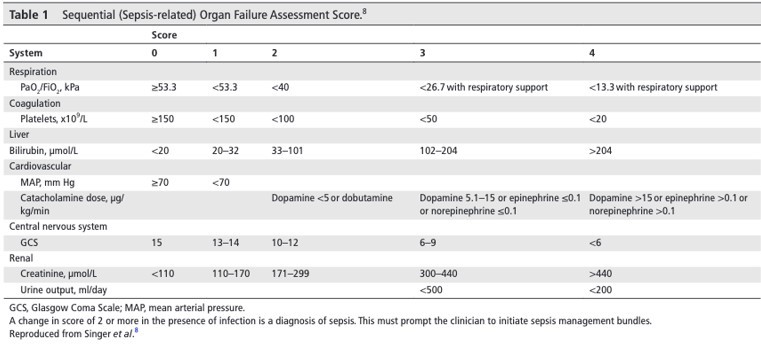 Aberrant regulation of normal physiological responses to infection, encompassing both pro-inflammatory and anti-inflammatory reactions, can lead to severe organ dysfunction. The clinical diagnosis of sepsis relies on the presence of infection in a patient and an elevated Sequential (Sepsis-related) Organ Failure Assessment Score (SOFA), with a change in score of 2 or more from baseline being indicative (table below).