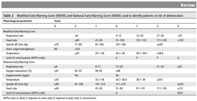 Many clinicians utilise track-and-trigger early warning score systems as a standard approach to identify patients at risk of deterioration. Two such examples are the National Early Warning Score (NEWS) and the Modified Early Warning Score (MEWS), commonly utilised in the UK (table below).