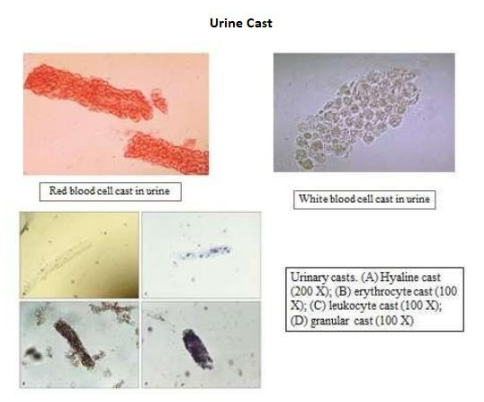- Cells: Erythrocytes, leucocytes, renal tubular epithelial cells