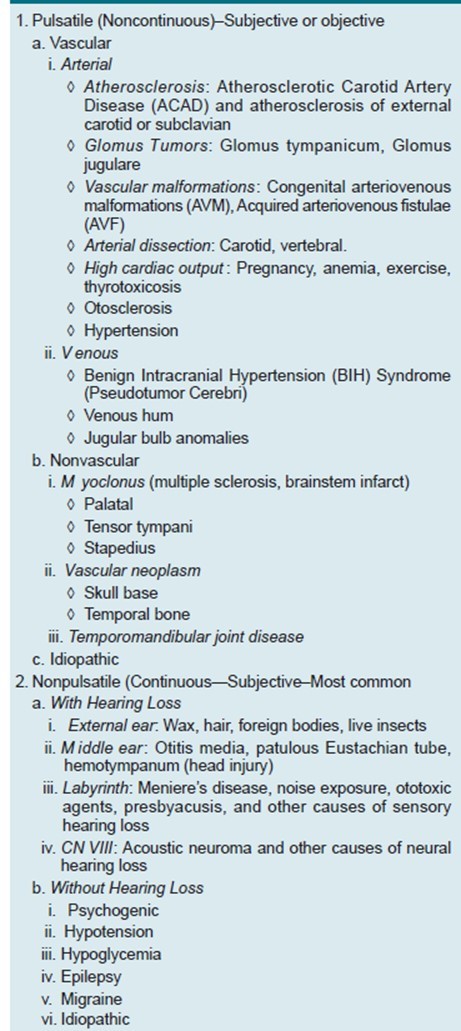 Subjective tinnitus has its origin in the external ear, middle ear, inner ear, VIIIth nerve or the central nervous system. Systemic diseases like anaemia, arteriosclerosis, hypertension and certain drugs may behave through the inner ear or central auditory pathways. In the presence of conductive hearing loss, the patient may hear abnormal noises in the head during eating, speaking or even respiration.