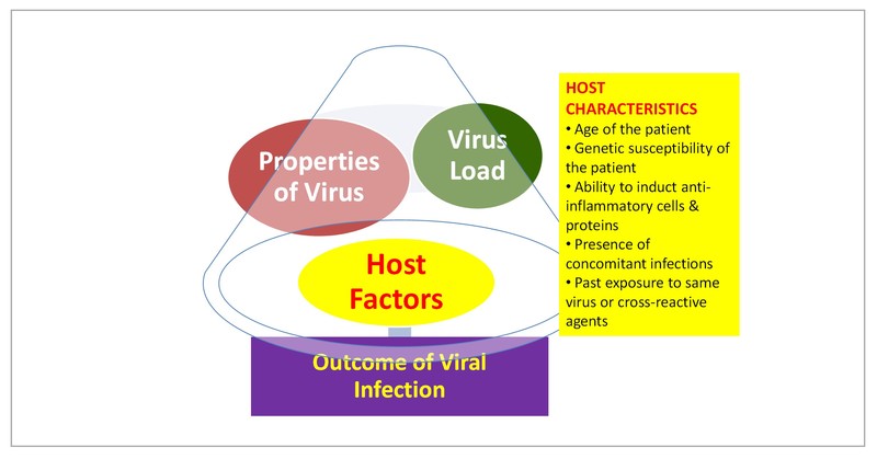 - Several host factors which include- age of the host, genetic susceptibility, ability to induct anti-inflammatory cells and proteins, presence of concomitant infections and past exposure to same virus or cross-reactive agents