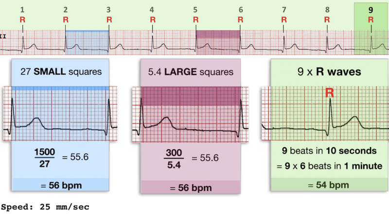 Divide 300 by the number of LARGE squares between two R waves (R-R interval Equals one beat) to get the beats per minute (bpm).