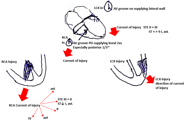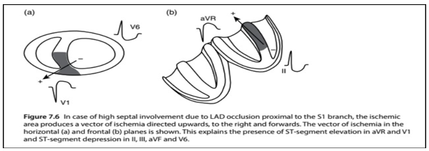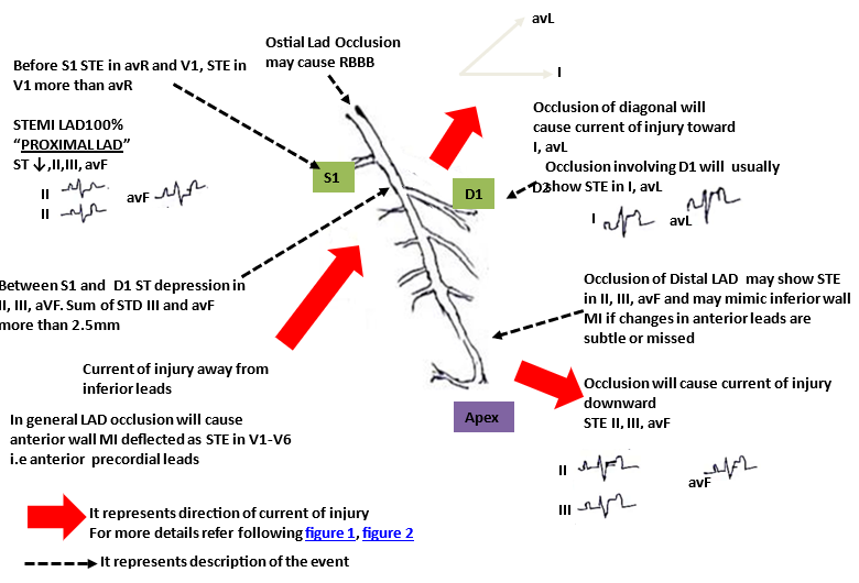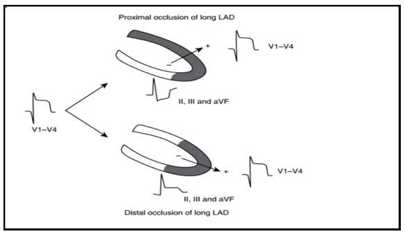 Figure 2: Current of injury in proximal vs Distal LAD and resulting different changes in ECG