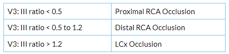 V3 to III ratio magnitude of ST depression in lead V3 relative to STE in lead III