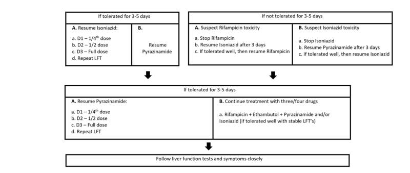 The drugs known to cause hepatotoxicity are pyrazinamide, isoniazid, and rifampicin (in decreasing order of frequency). Given below is a series of protocols followed for drug-induced hepatitis management in a government hospital.