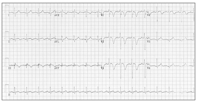 Over the next 3 days, she was not well; was feeling very weak with poor intake of food and water. Three days later, she developed severe chest tightness and shortness of breath, lasting for 30 minutes, accompanied by sweating. She was rushed to the hospital. She had no past medical history of heart disease, but history of hospitalisation due to COAD exacerbation 2 years back. No H/O fever or sore-throat and she could not remember when she passed urine last.