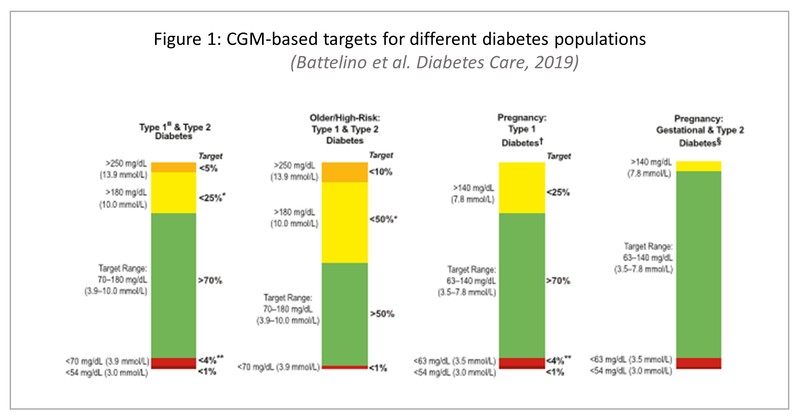 The International consensus recommends a target range between 70-180 mg/dL for individuals with low risk type 1 diabetes and type 2 diabetes, and 63-140 mg/dL in pregnant type 1 diabetes, along with a set of targets for the time per day [% of CGM readings or minutes/hours].
