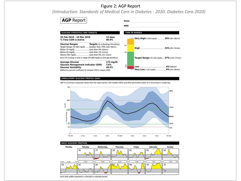 AGP originally developed by Dr.Roger Mazze in 1987 and currently owned by International Diabetes Centre, Minneapolis is meant for uniform reporting of blood glucose data so that the entire glucose data is collapsed to look like a model single day graph. AGP report and time in range was adopted by American Diabetes Association (ADA) in 2019 and are now included in the ADA 2020 clinical practice guidelines.