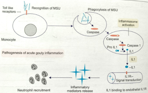 MSU crystals are phagocytosed by macrophages triggering formations of inflammasomes which result in the formation of proinflammatory cytokines, especially IL 1β. Inflammosomes are multicentric cytoplasmic protein complex which acts as molecular platforms for the activation of inflammatory caspases following stimulation by foreign agonists.