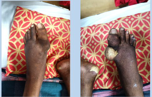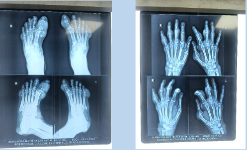 Lab reports revealed se uric acid 13.2 mg/dl, ESR-50mm/1st hour, CRP-26mg/L, radiologic examination showed soft tissue swelling & destruction of 1st MTP joint.