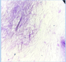 Demonstration of crystal- Aspiration of joint fluid seen under polarised microscope shows needle-shaped urate crystals, negatively birefringent, (intracellular crystals seen in acute gout and extracellular crystals seen in chronic gout).