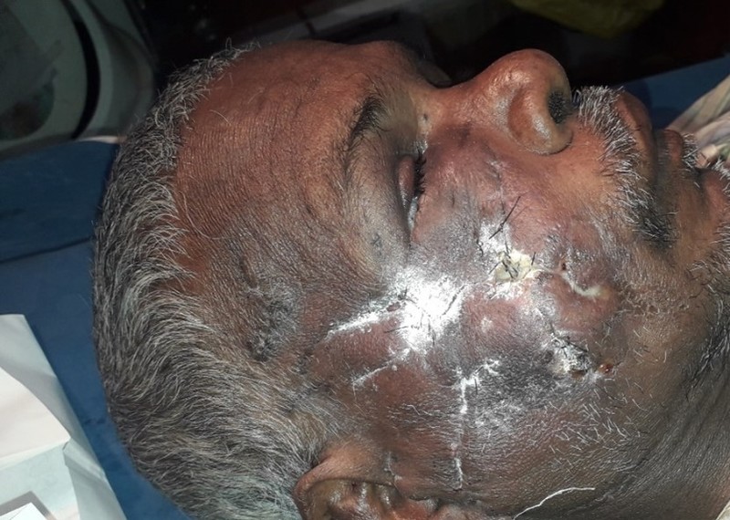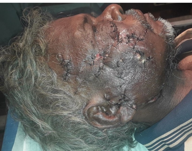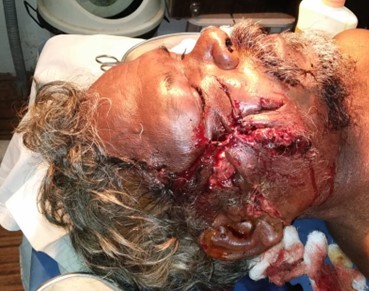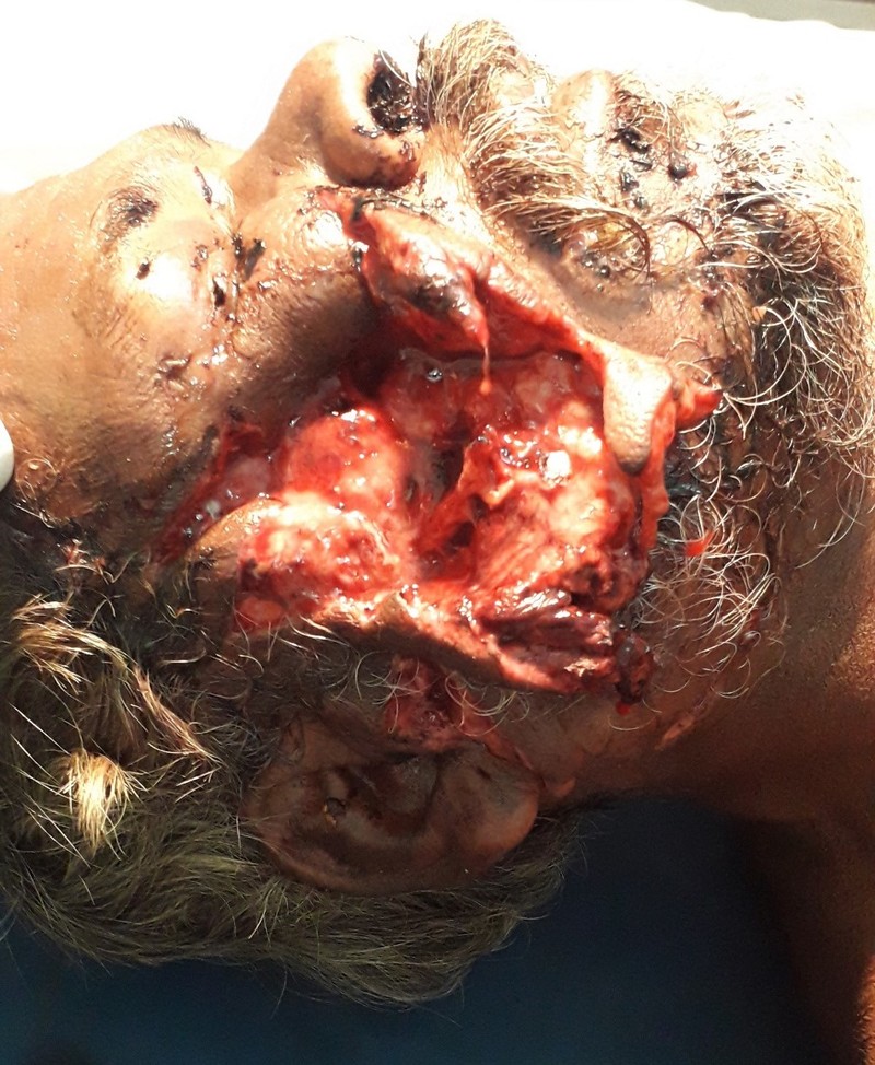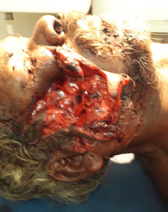 At 8.10 am on 17 December 2019, a 65-year-old male presented at the emergency with a ripped-off injury to the right side of the face. He had been mauled by a bear around 14 hours ago and had to wait for daybreak to begin the long trek to the hospital. The presentation was grotesque with the entire right cheek ripped off. Fortunately, the eyes, pinna and nose were spared. There was no active bleeding from the wound. Figure 1 shows the initial presentation: