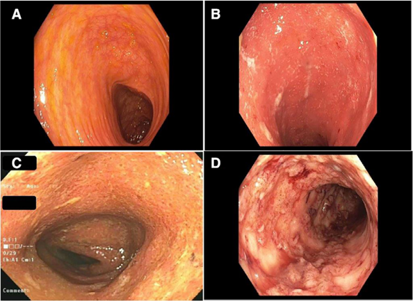 Colonoscopy images showing (A) normal colon, (B) mild colitis, (C) moderate colitis, (D) severe colitis
