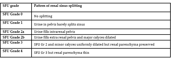 - The Society of Fetal Urology [SFU] has classified hydronephrosis based on the renal pelvicalyceal dilatation into 5 grades – 0 to 4. The severity of hydronephrosis increases with grade [Table]. However, a study has shown that neither the renal APD nor the SFU grading is the standard in determining the severity of antenatally detected hydronephrosis.