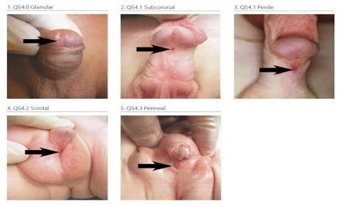 - Hypospadias with/without chordee: Urethral meatus placed ventral aspect, more proximal anywhere between glans to the perineum. Classified according to the position of the meatal opening as glandular (on the glans penis), coronal, sub-coronal, mid-penile, penoscrotal, scrotal and perineal (Fig. 1). Depending on the severity as suggested by the proximalisation and association of hypospadias with chordee (ventral penile curvature), surgical correction is warranted. The ideal age of repair is 6 to 12 months. Circumcision is contraindicated as the foreskin is required for most of the repair. DSD should be suspected in newborns with proximal hypospadias along with cryptorchidism.