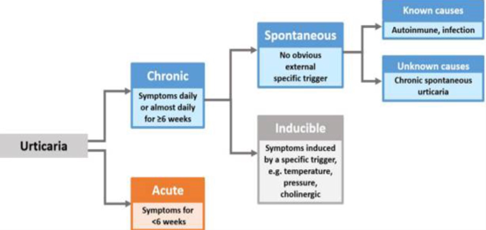 Urticaria, with or without angioedema, can be classified as acute or chronic. Urticaria that recurs within a period of fewer than six weeks is acute. Recurring chronic urticaria lasts longer than six weeks. Chronic spontaneous (idiopathic) urticaria (CSU), defined as the occurrence of wheals, angioedema, or both for more than 6 weeks, affects 1–2% of the population.