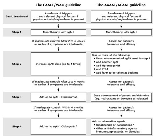 According to the guidelines given by EAACI first step is always to avoid allergens and triggering factors and start with antihistamines drugs. If no control with antihistamines after 2-4 weeks increase the dose of antihistamines up to 4times the usual dose. If still no control after 2-4 weeks add Omalizumab ( monoclonal antibody against IgE). Still, if still no control after 6months add cyclosporine to antihistaminics