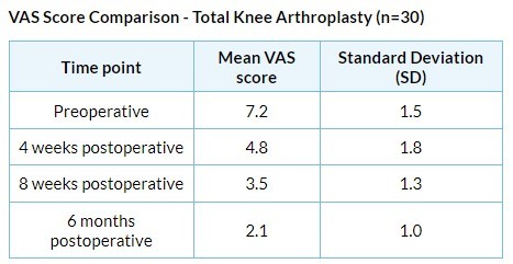 This study evaluates the effectiveness of Total Knee Arthroplasty (TKA) in reducing pain associated with knee osteoarthritis by comparing Visual Analogue Scale (VAS) scores preoperatively and at multiple postoperative intervals.