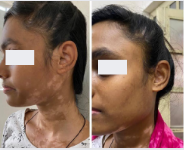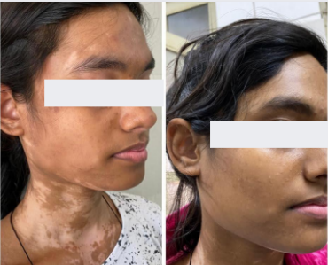 The patient had noticed depigmented patches on her cheek and forehead for the past six months. After a thorough examination and confirmation of the diagnosis, treatment was initiated with topical tacrolimus 0.1% ointment twice daily.