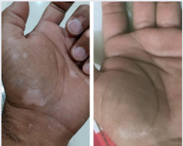 The patient received three weekly sessions of NB-UVB phototherapy, with a gradual increase in the dosage based on individual tolerance. After six months of treatment, there was noticeable repigmentation in several areas, including the elbows, knees, and hands.