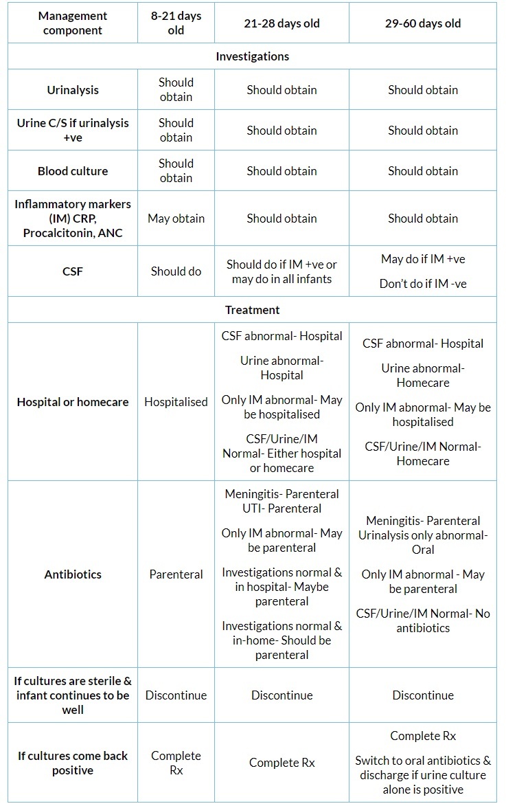 - In a well-looking, 29-60 days old febrile infant admit for parenteral antibiotics if CSF analysis is abnormal. The patient can be managed at home with oral antibiotics if UTI is suspected, and with no antibiotics, if all investigations are normal.
