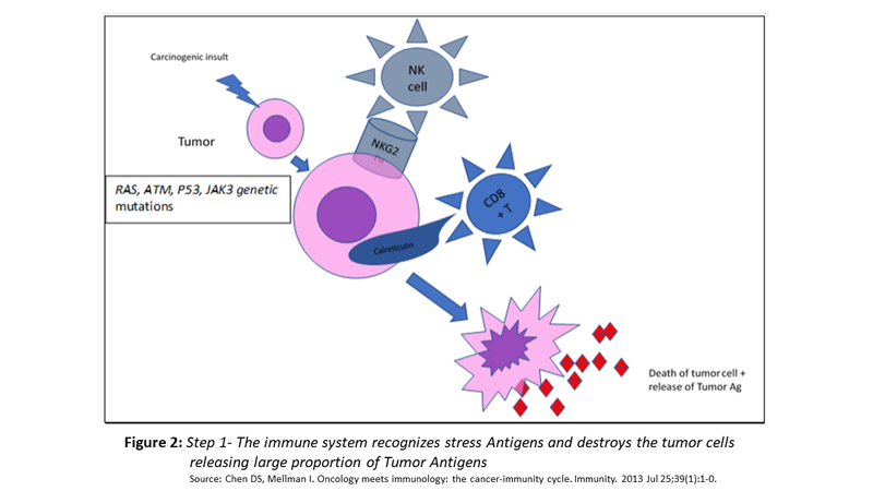 - In addition, tumour cells express antigens produced by stress response to DNA damage such as surface calreticulin and or NKG2D ligands recognised by CD8+ effector cells and NK cells, respectively. These interactions result in tumour cell lysis and abundant release of tumour antigens (as shown in Fig. 2)