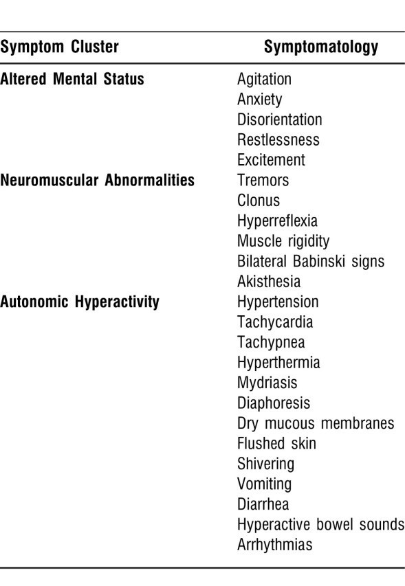 Patients with mild cases may be afebrile but have tachycardia, with a physical examination that is notable for autonomic findings such as shivering, diaphoresis, or mydriasis. The neurologic examination may reveal intermittent tremor or myoclonus, as well as hyperreflexia. A moderate case involves such vital-sign abnormalities as: