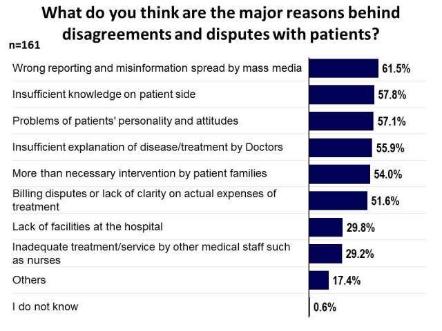 “Wrong information and misreporting by mass media” is cited as the top reason that leads to patient-doctor disputes. The other possible reasons cited by doctors as a reason for dispute are “insufficient knowledge on patient’s side”, “lack of adequate hospital facilities, billing disputes and lack of clarity of expenses”